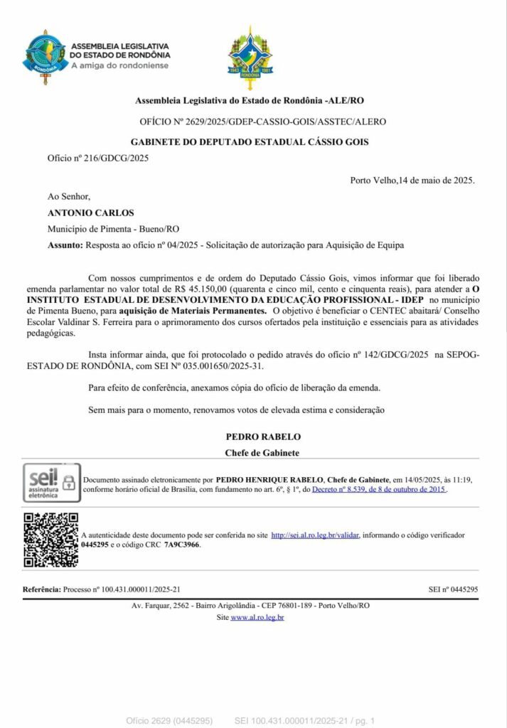 O Instituto Abaitará recebe uma emenda parlamentar no valor de R$ 45.150,00 (quarenta e cinco mil, cento e cinquenta reais), destinada à aquisição de materiais permanentes. A liberação do recurso foi confirmada em resposta ao ofício nº 04/2025, enviado pela instituição.