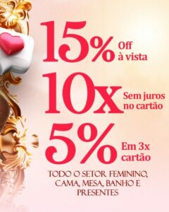 Os clientes poderão aproveitar 15% de desconto nas compras à vista, parcelamento em até 10 vezes sem juros no cartão, ou ainda 5% de desconto no pagamento em 3 vezes no cartão.